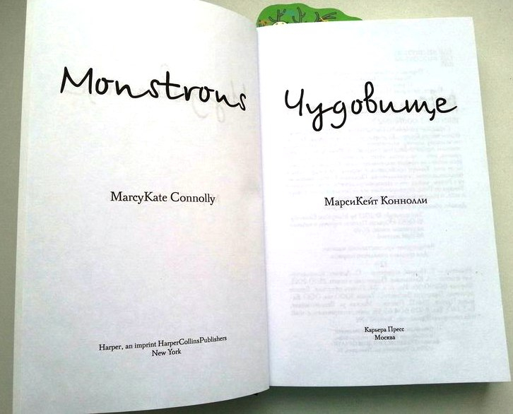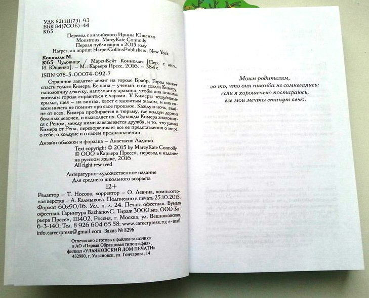 Коннолли Марси Кейт Чудовище. Сказка-фэнтези про девочку-чудовище. Кимера - девочка с хвостом и крыльями, вынуждена спасать больных девочек из проклятого колдуном города. Перевод замечательный, читается легко и быстро, много сюжетных переворотов. Первой на издание этой книги получила право Россия, после нас ее будут читать французы. Следующая книга автора будет основана на русских народных сказках. С радостью ее возьму. В книге нет иллюстраций, кроме обложки и форзаца. Бумага белая, гладкий офсет.