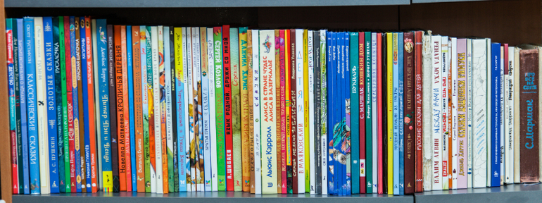 В маленькой коробочке книги на английском: картонные малого формата и "самиздат". Слева на полке стоят игровые и картонные книги.Справа - все остальное:)