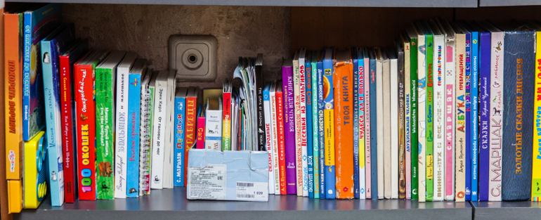 А вот и он. Нижние полки Левкины. Слева энциклопедии и слишком высокие книги. Справа тоненькие книги в коробках.
