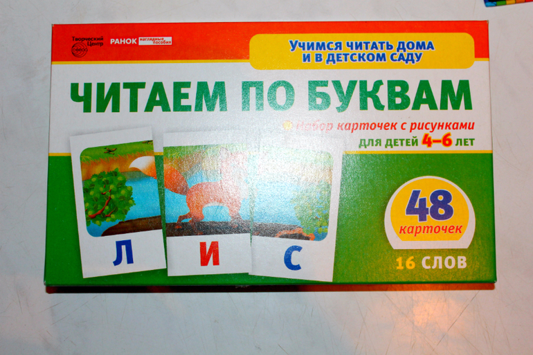 7)Для начала Игра «Читай по буквам» изд. Сфера. Дается 16 слов из 48 карточек. На всех карточек находится по одной букве под картинкой. Нужно собрать слово из трех букв и картинку. Данька первым делом ухватился не за книги, а за эту игру. Очень подходящий вариант для изучения букв и развития мышления.