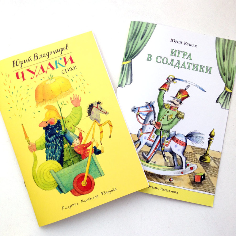 Две первые книги серии сделаны полностью с оригиналов. Это небольшой сборник стихов «Чудаки» Юрия Владимирова с иллюстрациями Михаила Федорова. И «Игра в солдатики» Юрия Кушака с иллюстрациями Рубена Варшамова.