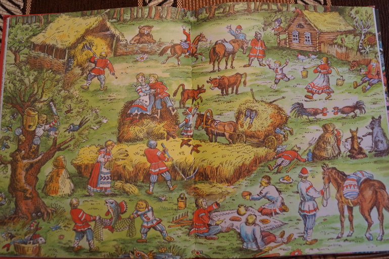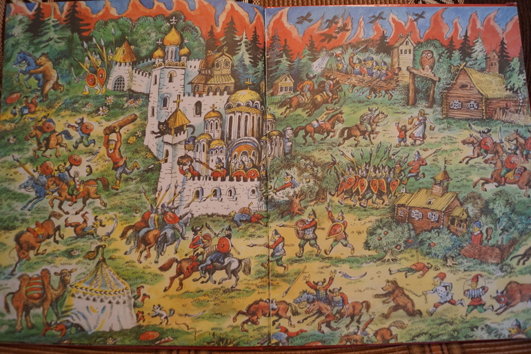 Море деталей, персонажей, сюжетов, сижу разглядываю... Не могу понять своего отношения к иллюстрациям. Меня, бывшего студента истфака, многое напрягает (медведи повсеместно бегающие по улицам русских городов, знамена войск, русалки и первобытные женщины с открытыми прелестями - да еще и какими). Наверное надо относится к иллюстрациям, как к карикатуре на исторические события. Тогда все станет на свои места.