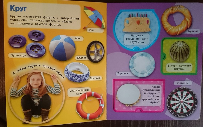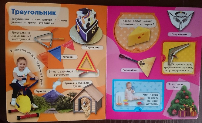 К каждому развороту подобраны предметы, которые повторяют форму геометрических фигур. В основном все предметы из нашего окружения, т.е. можно дома тоже самое посмотреть и убедиться, что это и вправду треугольное, а это квадратное и т.п.