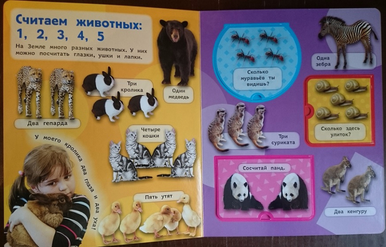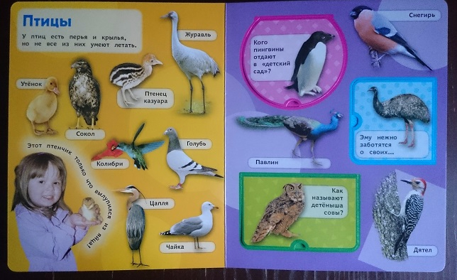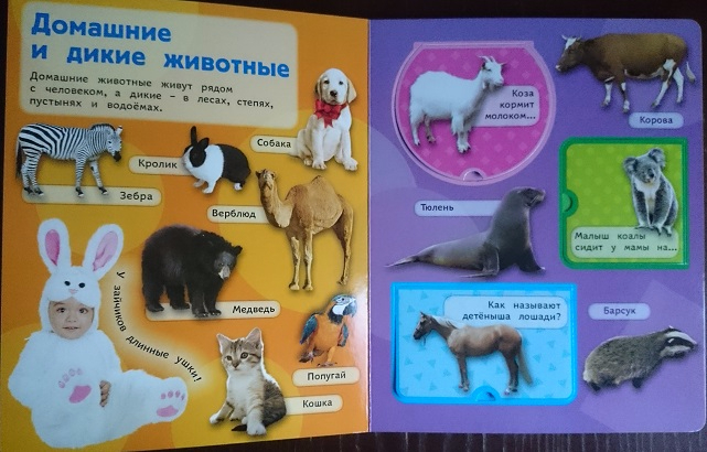 Когда покупала эту книгу то думала, что тут будут фотографии всех животных и рядышком их малыши, как на обложке. А книгу решили немного по-другому сделать: продолжили тему животных, а тему "мамы и малыши" поместили на разворот с открывающимися окошками, т.е. собственно кто кому малыш мы узнаем открывая окошки с вопросами.