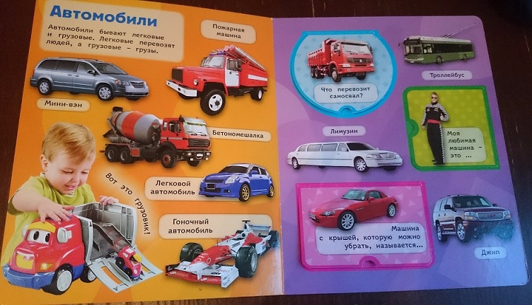 Автомобили, поезда, воздушные суда, водные суда. Очень интересно, что и ребенок, который присутствует на каждом развороте, играет то с грузовиком, то с поездом и т.п., в зависимости от темы, которую мы видим на развороте