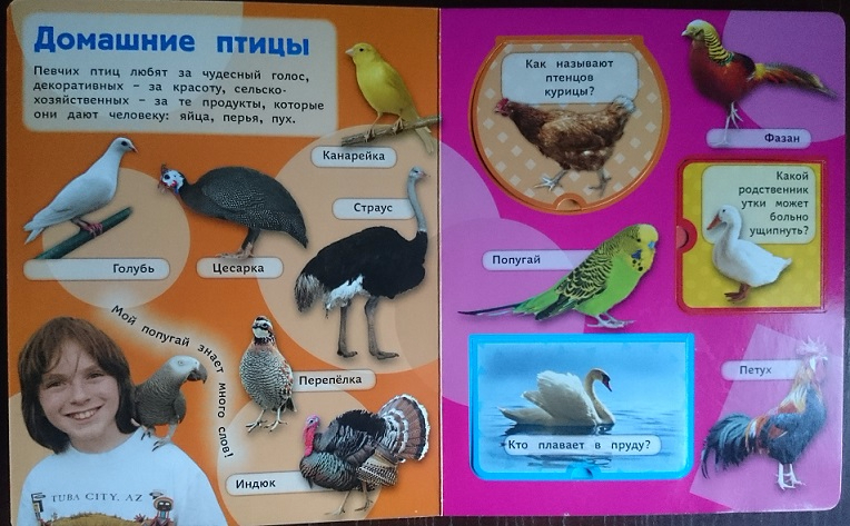 Домашние птицы: канарейка, страус, цесарка, голубь, перепелка, индюк, курица, фазан, гусь, утка, попугай, лебедь, петух.
