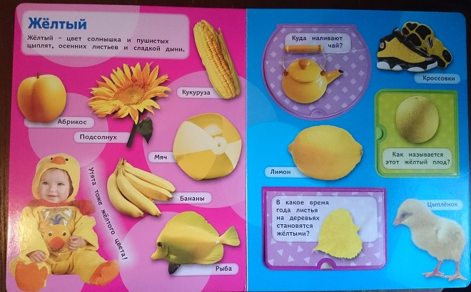 В эту серию вошли десять книг с разными темами: домашние животные, дикие животные, цвета, формы, транспорт, мамы и малыши, счет, мой дом, книжка про меня, первые слова. Материал в книге представлен в виде фотографий, заметок и забавных заданий. Фотографии очень реалистичные, четкие, яркие. Каждый разворот посвящен одной теме, где можно увидеть заметку в виде краткой информации, фотографии, которые идут с подписями и три открывающихся окошек, сверху вопрос - внутри ответ с фотографией. Книги рассчитаны на возраст 1+, некоторые темы совсем простые, а некоторые посложнее, примерно к 3 годам.
