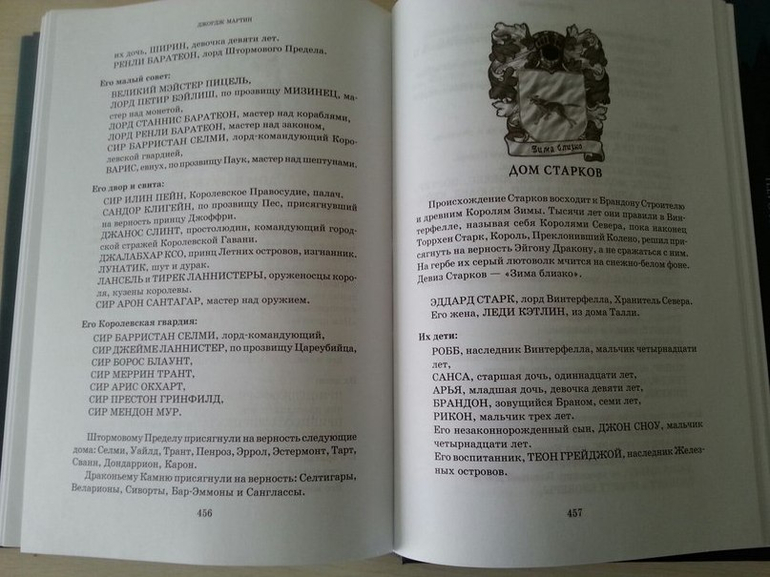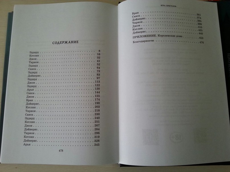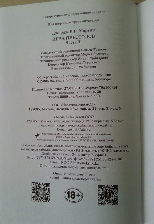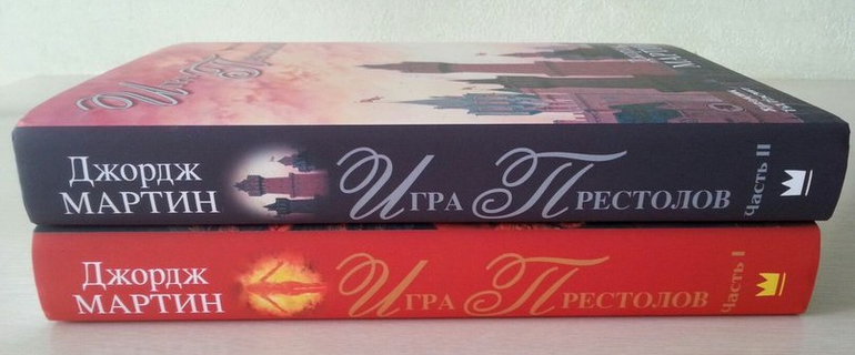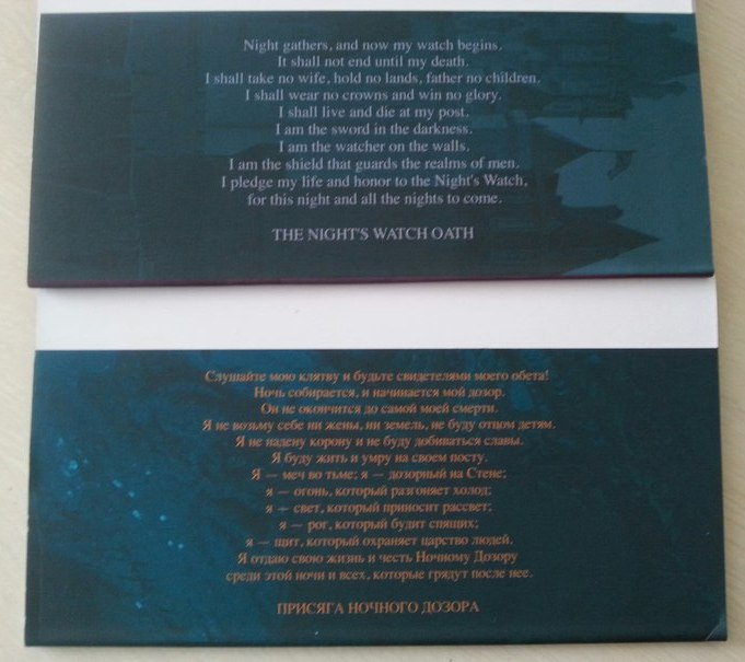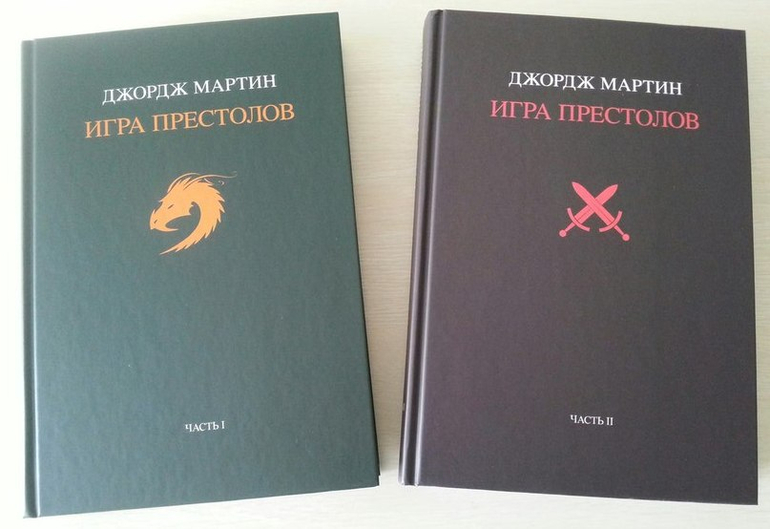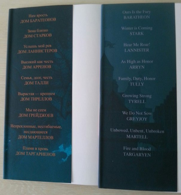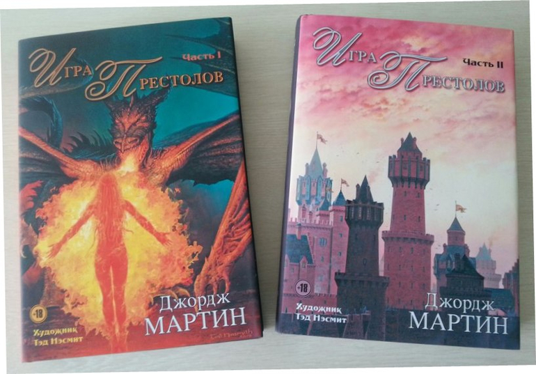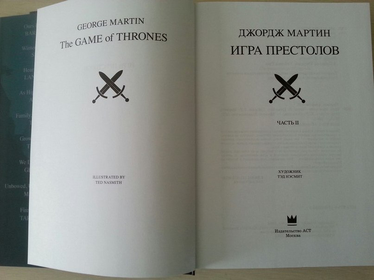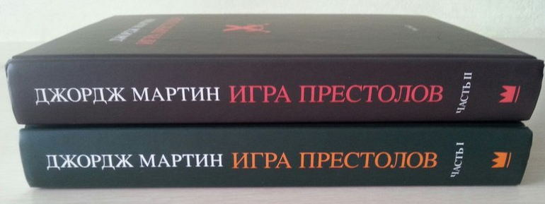 Книга первая выпущена в двух частях издательством АСТ Mainstream. Бумага белый плотный офсет. Шрифт крупный. Тираж 5000 экз.Суперобложка и обложка очень приятные на ощупь. Внутренние стороны суперобложки задействованы, со стороны форзаца в них напечатаны девизы королевских домов, со стороны нахзаца - присяга ночного дозора (в первой части текст приведен на русском языке, во второй части - на английском). 18+ (публикую с разрешения модераторов).