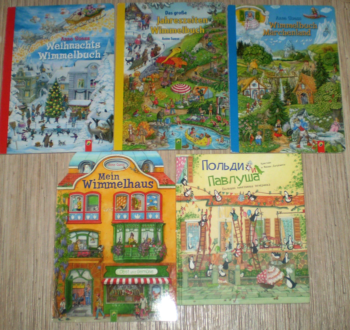 У нас (как так случилось я и сама не пойму) - нет ни одного виммеля из Германии)) Но есть некоторые, которые перевели и продают в России, например, в год сынок просто обожал Однажды в городе!!! Зимнюю книгу любил (голая тётка в ней, кстати))... А вот улыбку, вообще, не хотел смотреть, кроме фермы((книги про стройку и технику на ферме вышли уже позже). В определённый возраст его интересовали только машинки)) Сейчас зато полюбил - пора уже и из Германии выписывать новые виммели))