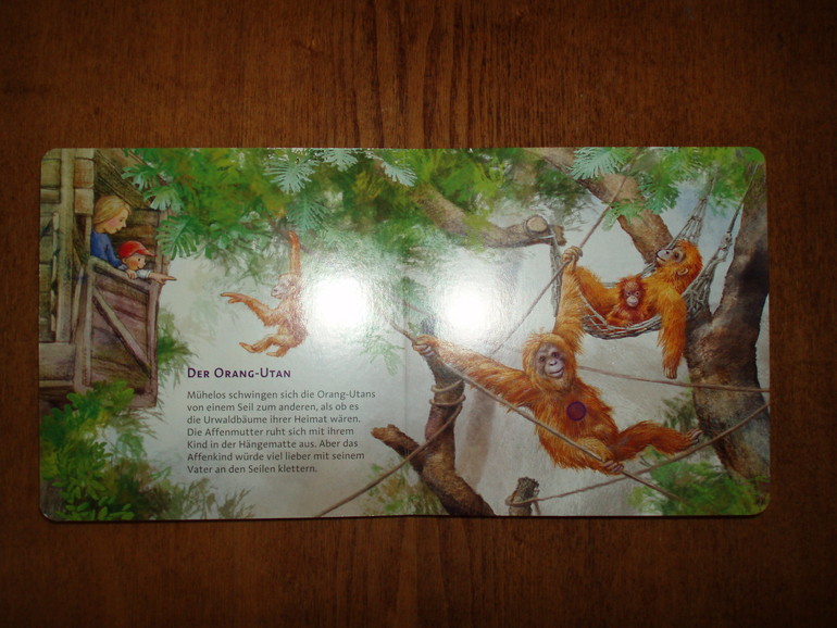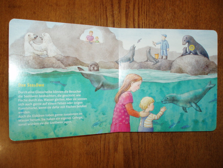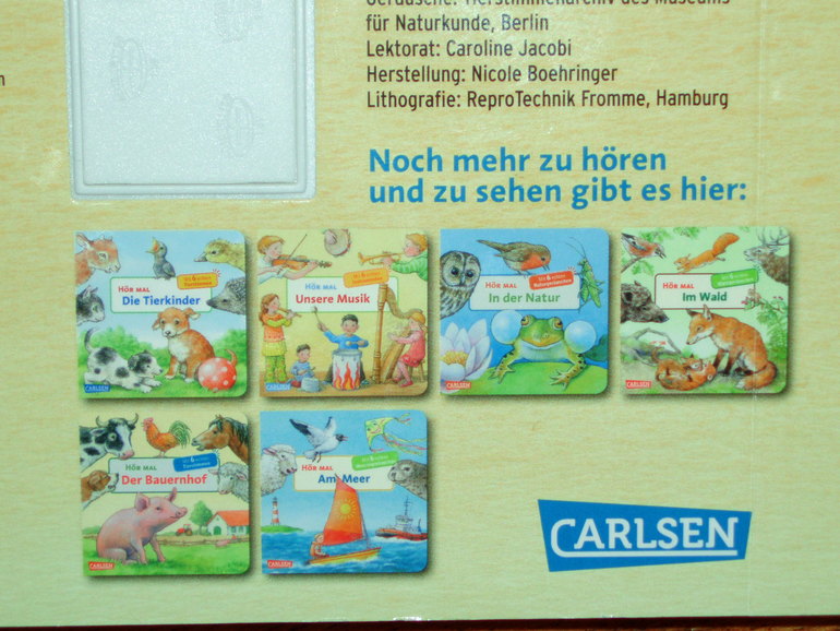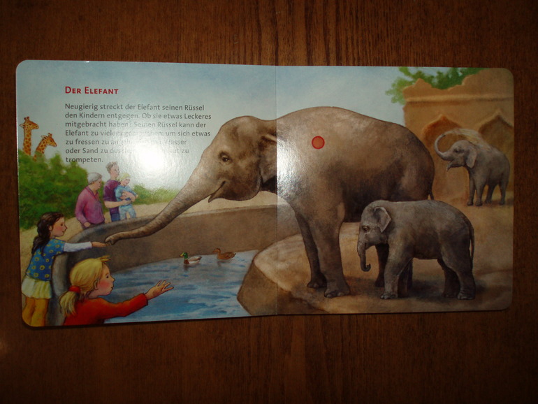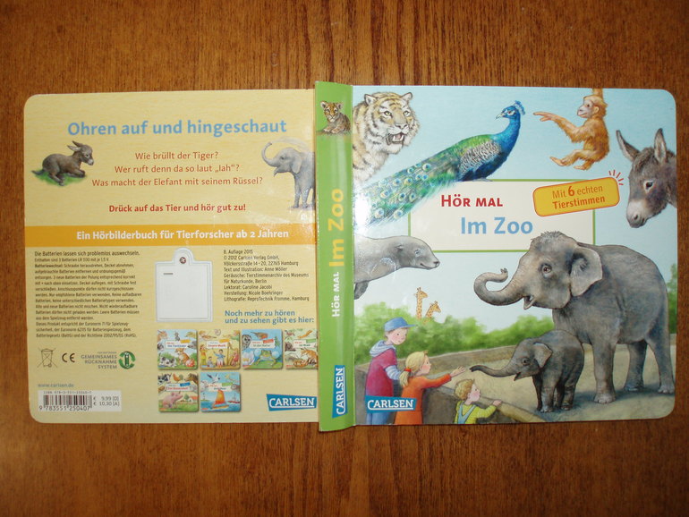 И о качестве. Оно изумительное! Очень /супер, экстра, макси/ плотный глянцевый картон, закругленные углы, четкая печать, красивые иллюстрации и завораживающие голоса животных и птиц! Размер книги 18х18х2,2 см, толщина каждой страницы 2 мм (для сравнения - толщина страницы в книге из серии "Первые книги малыша. Учим новые слова" издательства "Улыбка" - меньше 1 мм) . Последняя страница гораздо толще, поскольку содержит звуковое устройство и 3 батарейки. Настоящее немецкое качество! Вот уж, действительно, прослужит не одному поколению! Дочка второй день не выпускает книгу из рук, особенно нравится страница с морским львом :) И почему я не купила эту книгу раньше?