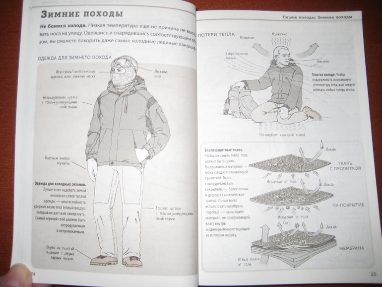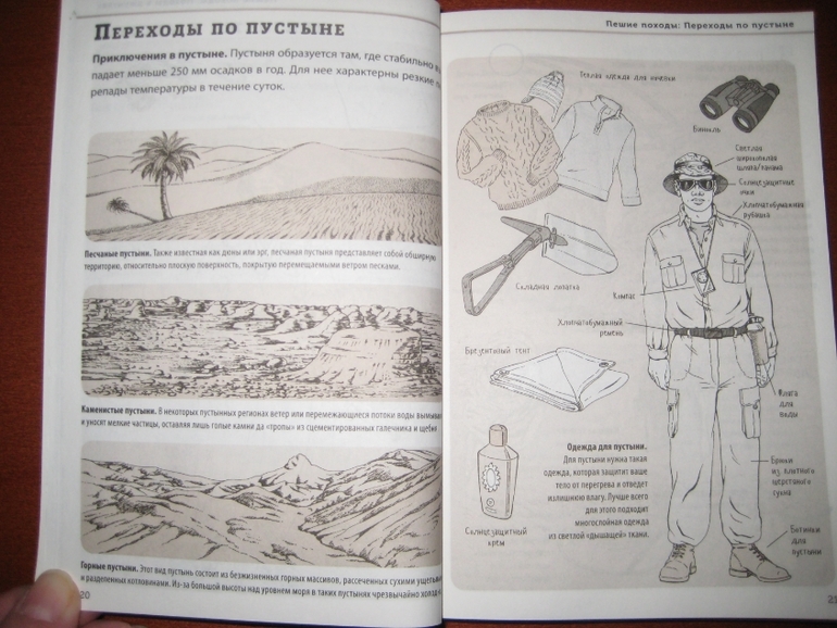 Не могу не отметить исключительно наглядные и понятные картинки и схемы, а также толковые, без воды и всего лишнего, комментарии. И когда читаешь, впечатление такое, что ни о чем не забыли, все предусмотрели, настолько тонкие моменты затрагиваются, например, каков оптимальный угол заточки лезвия ножа в зависимости от цели использования, каковы варианты укладки костра и как добыть огонь при помощи аккумулятора мобильного телефона, как понять, съедобное ли растение и т.д. Это действительно сборник полезных практических советов на все случаи походно-полевой жизни.
