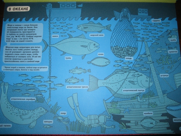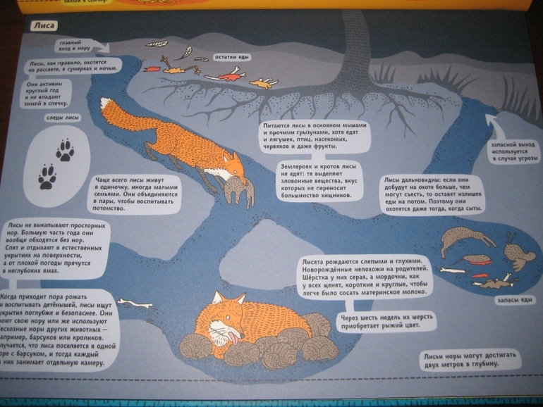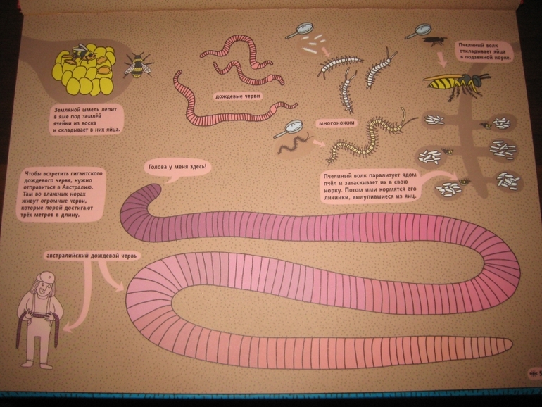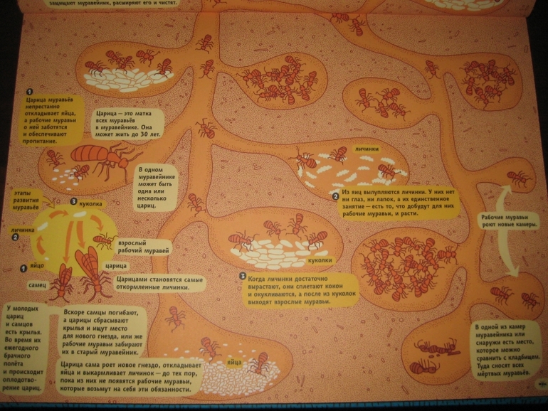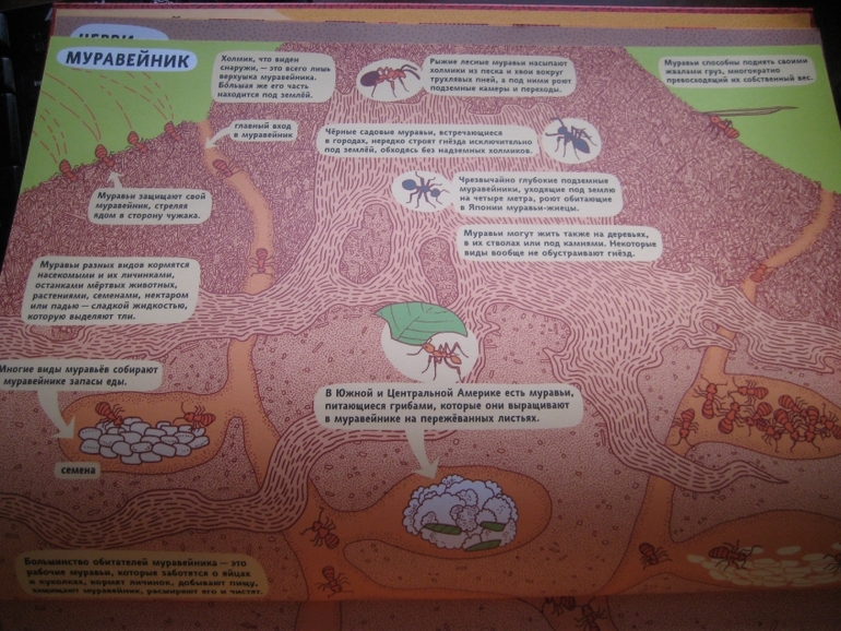 Книга, безусловно, производит впечатление: ну прежде всего она просто огромная! И читается как альбом, к тому же некоторые развороты образуют единую, целостную картинку: открываешь такую и надолго над ней зависаешь, разглядываешь рисунки, подписи, выстраиваешь в логической последовательности, например, разворот про муравейник (мы тут же весьма кстати вспомнили все наши знания о муравьях, почерпнутые из книжек про Ферду).