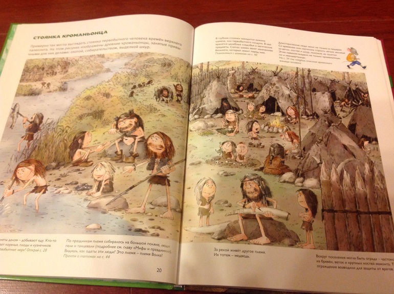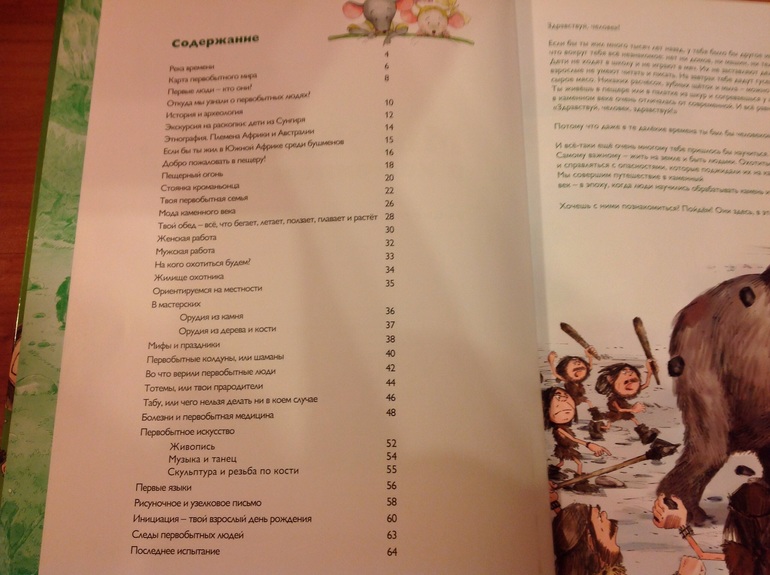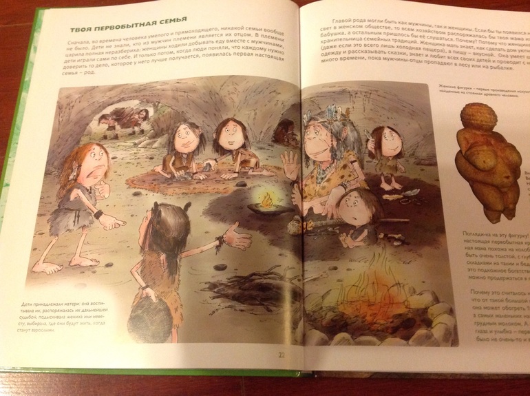 Как видите, список тем довольно обширен, но это не самый большой плюс этой книги. Мы уже начинали читать книги на эту тему, брали в библиотеке и читали с пятого на десятое... Думала, что с этой книгой будет тоже самое, ан-нет... Прочитали от корки до корки, причём два раза подряд!!! Книга-просто клад!!! Так хитренько, методом погружения отправляет она маленьких читателей в каменный век и рассказывает подробненько и увлекательно, что бы там с ними происходило, если они рождены мальчиком или девочкой... Кстати, мы не так давно обсуждали книги подобных тематик с одной подругой, и она жаловалась, что все они ориентированы на мальчиков, а девочкам, которые у нас сплошь принцессы, совершенно не интересна охота на мамонтов и орудия труда... Так вот, эта книга, уверена, будет интересна и девочкам тоже. Кроме того, что описана роль девочки и женщины в общине, очень интересно описаны ритуалы и табу, медицина и искусство... Так что рекомендую всем-всем!!!