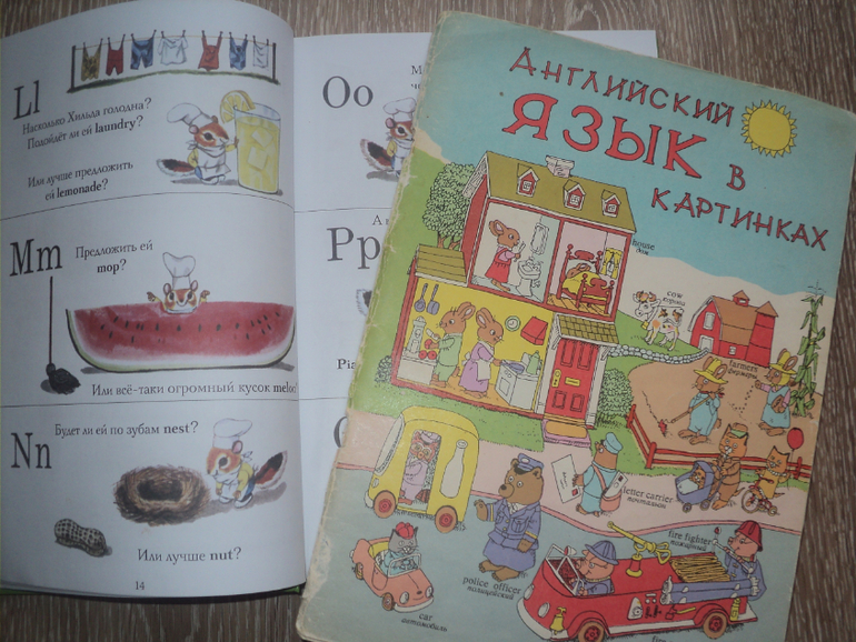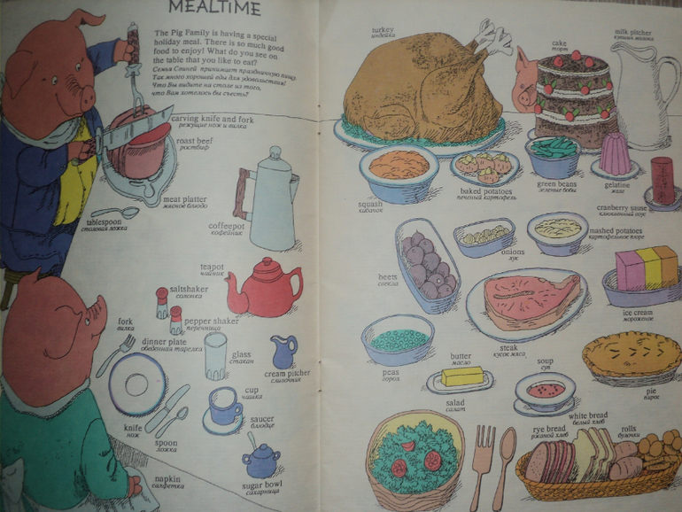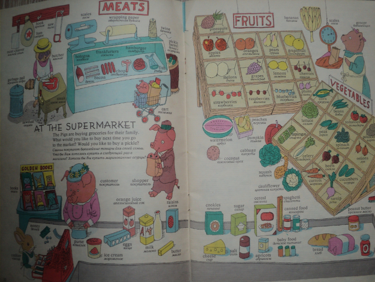 Достала я нашу древнюю книжку того же Скарри, но уже на английском. Учим с сыном продукты в супермаркете и то, что хрюшки едят на обед.