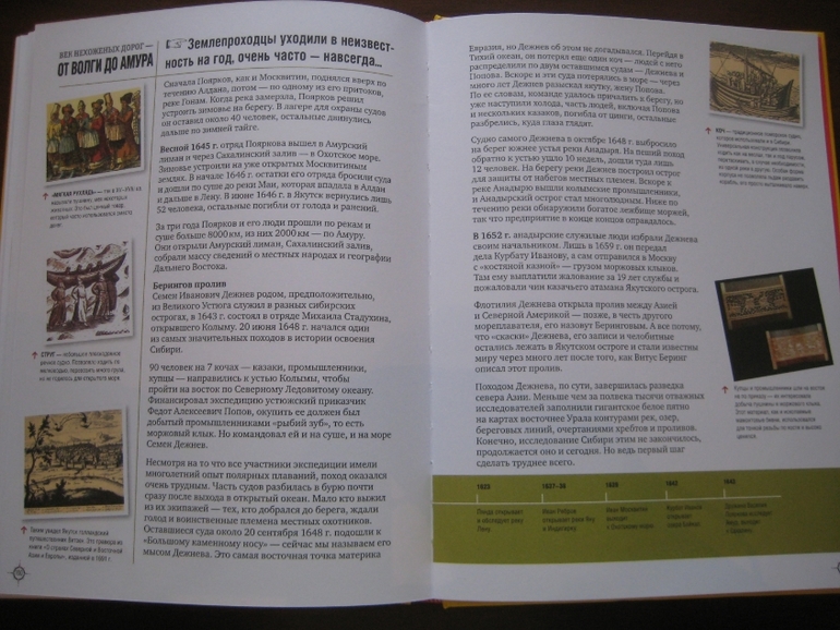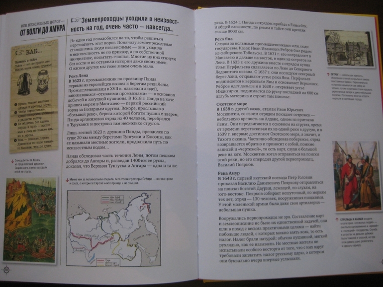 Отдельная глава в книге (три разворота) посвящена русским первопроходцам, покорителям Сибири ("территорий восточнее Урала"):
