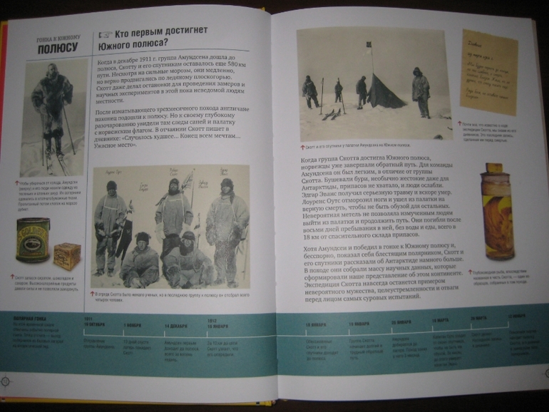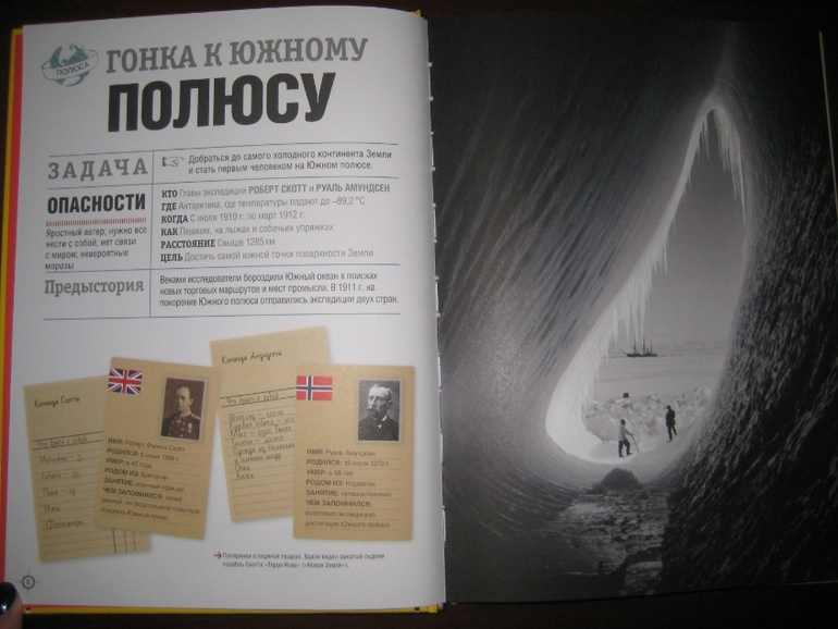 Пока читала, все размышляла о том, для кого же конкретно может быть полезна эта книга. И пришла к выводу, что для самого первого знакомства с темой она не очень, на мой взгляд, подходит. Ну хотя бы потому, что это первое знакомство обычно осуществляется еще в дошкольном возрасте, предполагающем облегченную, познавательно-развлекательную форму подачи материала. А здесь текст вполне серьезный. Более того, он определенным образом структурирован, даже не как в энциклопедии, а как в каком-нибудь справочнике. Вот, например, рассказ о знаменитом противостоянии двух выдающихся покорителей Южного полюса Роберта Скотта и Руаля Амундсена: