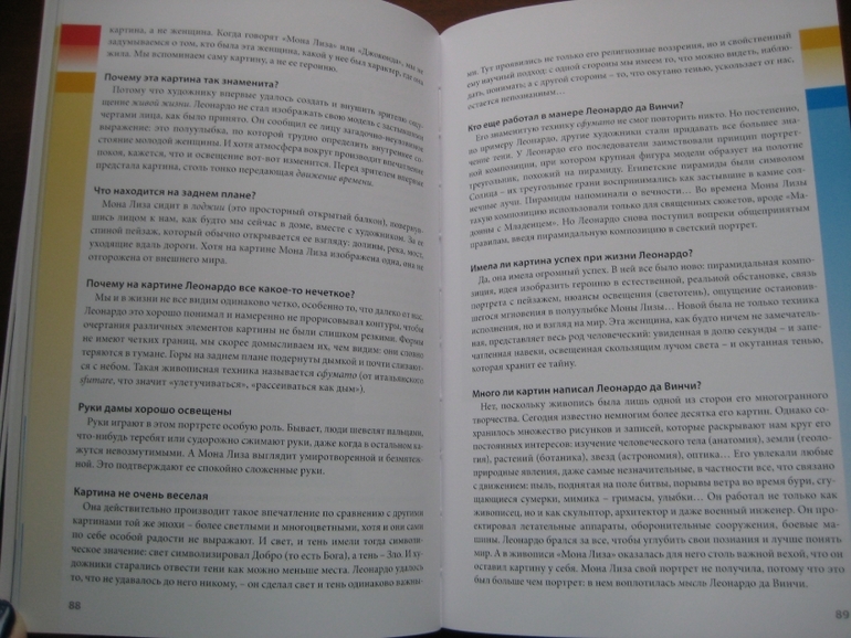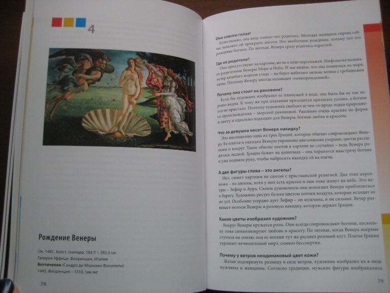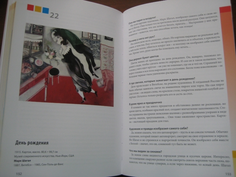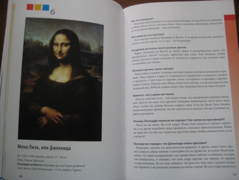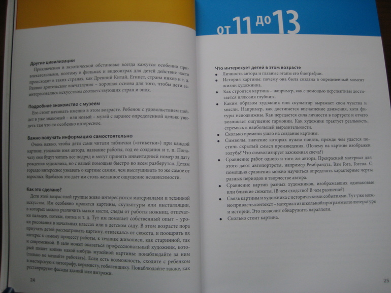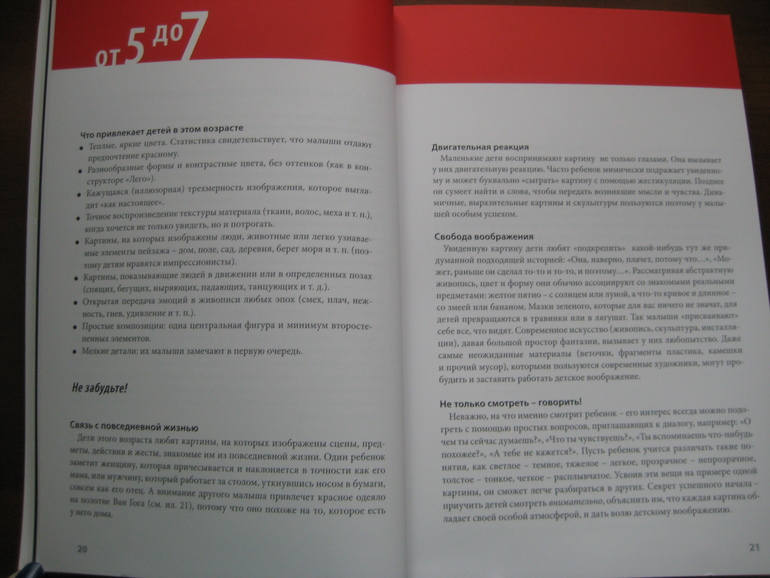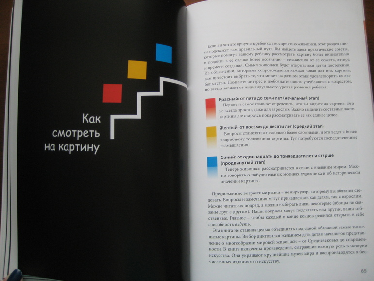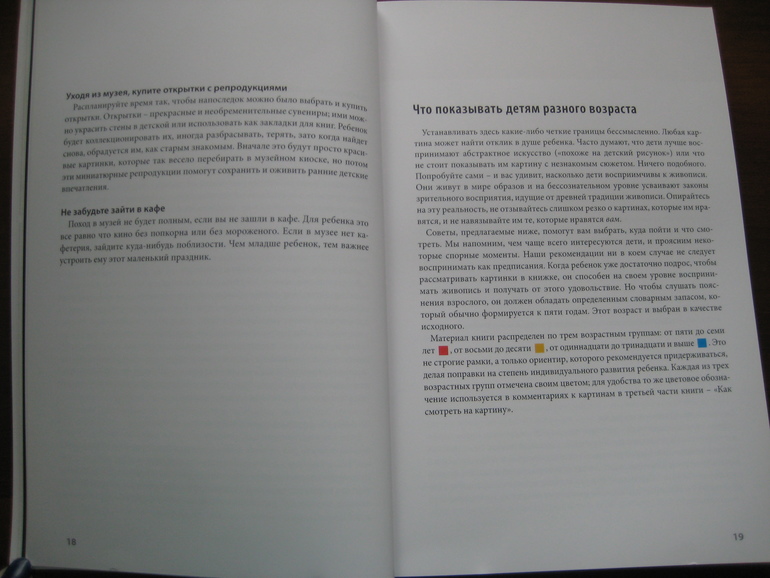 Полезно распределение материала по возрастным категориям: от пяти до семи лет, от восьми до десяти, от одиннадцати до тринадцати и выше, поскольку понятно, что каждому возрасту присущи определенные особенности восприятия живописи. Хорошая идея - выделение материала для каждой возрастной категории цветом. Удобно и практично. Т.е. книга для работы, а не для почитать и положить на полку :)