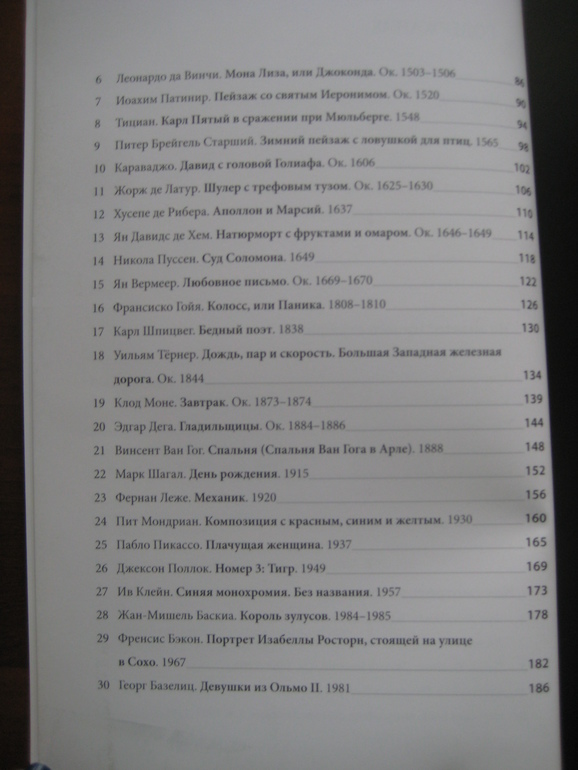 Картин для разбора предложено 30, самых разных художественных направлений, что тоже является несомненным плюсом книги, хотя меня немного огорчило, что здесь не нашлось места ни одному русскому художнику, за исключением только Марка Шагала, который хотя бы родом из России. В общем, за державу как всегда, когда речь идет о переводной книге, обидно.