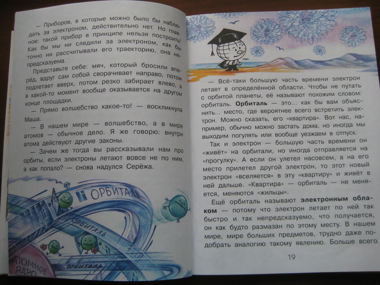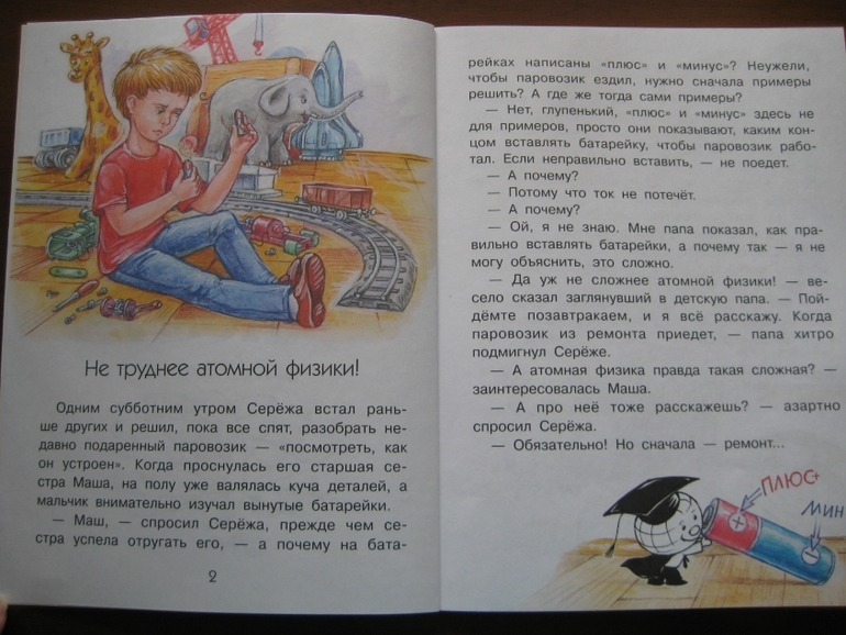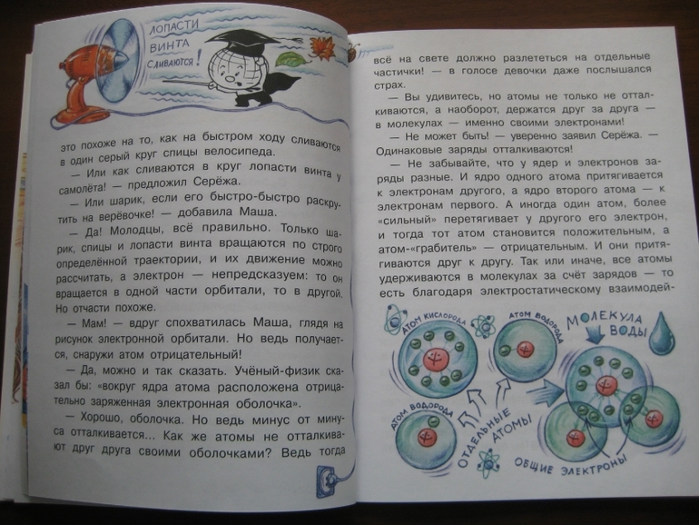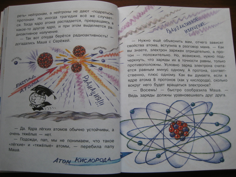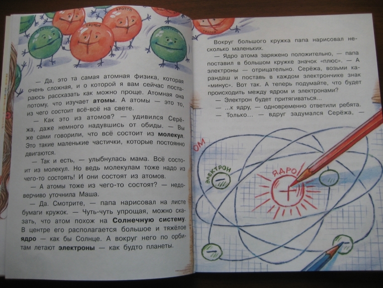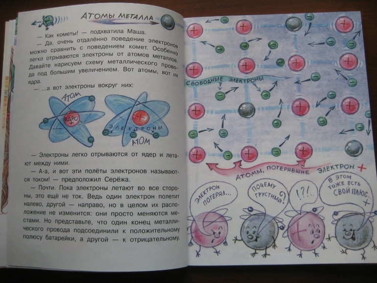 Во-первых, не устаю восторгаться той серьезностью, с одной стороны, и системностью - с другой, с которыми автор подходит к делу. Да, книжка для детей, но она отнюдь не примитивна, без сюсюканья, без стремления заменить сложные понятия чем-то менее сложным. Здесь есть и электростатическое взаимодействие, и принцип неопределенности движения электрона, и орбиталь или электронное облако, и радиоактивность, и альфа-излучение, и еще много чего другого, столь же интересного. Начинается все с азов, в данном случае, с батарейки, в которой есть плюс и минус, а заканчивается устройством атомной электростанции.