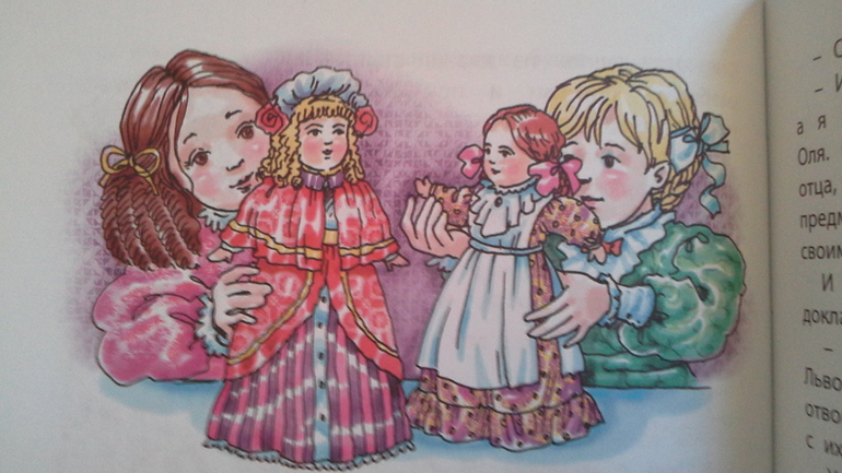 Первая книга "Олины затеи" рассказывает о том,как две девочки- сестрички проводят время за игрой в куклы.