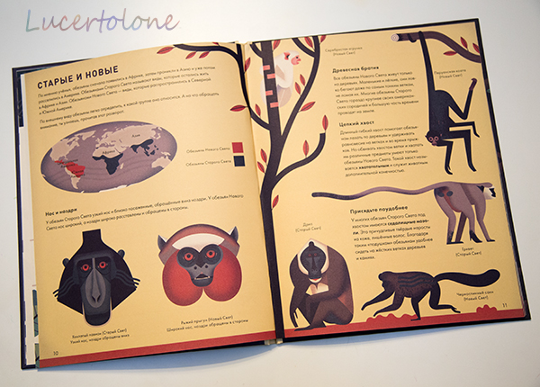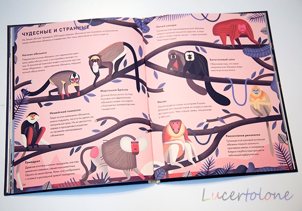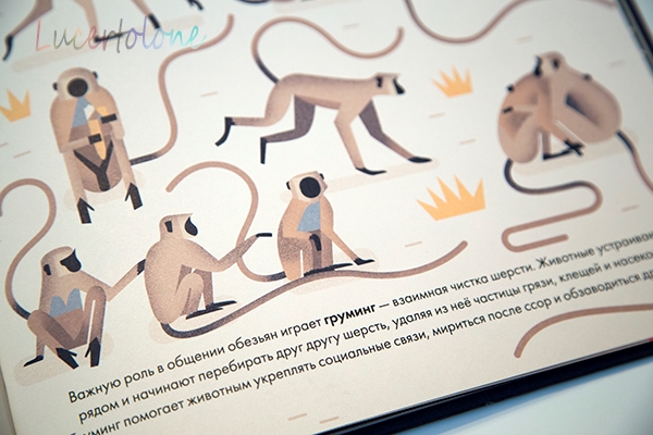 Поэтому книга и поселилась на нашей прикроватной тумбочке. Мы читаем понемногу, смакуем. На полуслове не прерываемся. Речь идет об обезьянах, бесспорно, но каждый разворот повествует об отдельной главе из их жизни, что весьма удобно для чтения с перерывами.