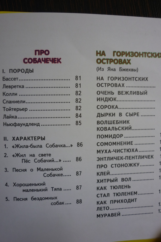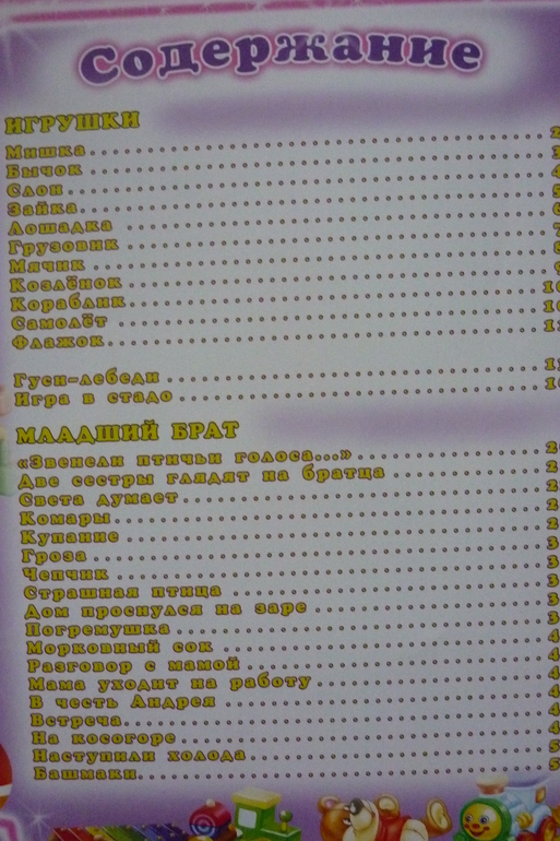 Весь сборник можно разделить на 6 частей : Игрушки. Младший брат. Вовка добрая душа. Настенька. Я расту. Было у бабушки 40 внучат. Рисунки детские, но в тоже время очень реалистичные.