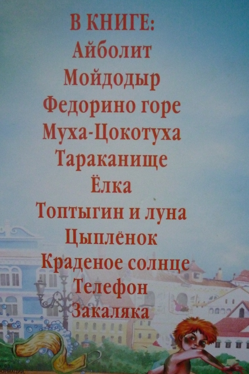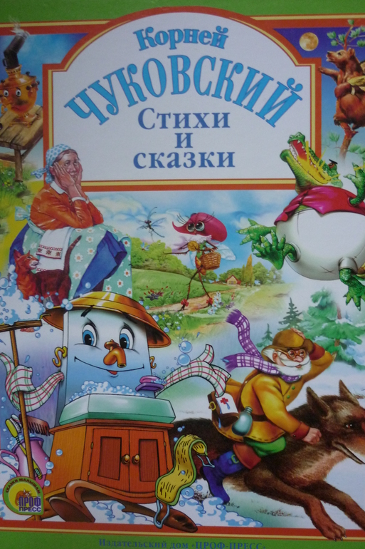 Книгой я довольна, обложка плотный картон, мелованные листы. Издательство «Проф-Пресс» В книгу вошли : Айболит, Мойдодыр. Федорино горе, Муха-Цокотуха, Тараканище, Елка, Топтыгин и луна, Цыпленок, Краденое солнце. Телефон, Закаляка.