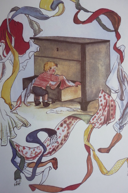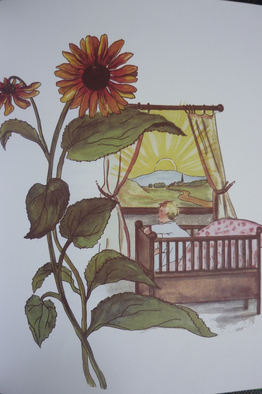 На каждом развороте по одному четверостишию и большая иллюстрация. В книге рассказывается о жизни ребенка. Его играх, делах: проснулся малыш, поиграл с ситечком и водичкой ( вот это да, а водичка то выливается из ситечка); посадил бобы, а они выросли ростом с мальчика; а вот это ситуация не знакома каждой маме: