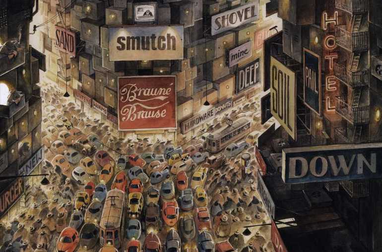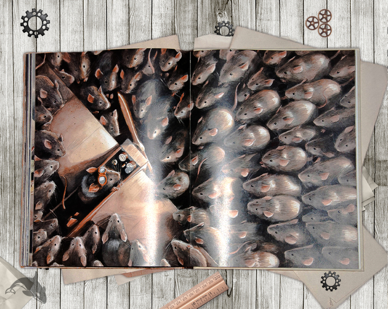Для тех, кто еще не познакомился с книгой, расскажу немного подробнее. "Невероятные приключения летающего мышонка" - это дипломная работа замечательного немецкого иллюстратора Торбена Кульманна. Никакой компьютерной графики, только карандаши, акварели и другие волшебные художественные инструменты.