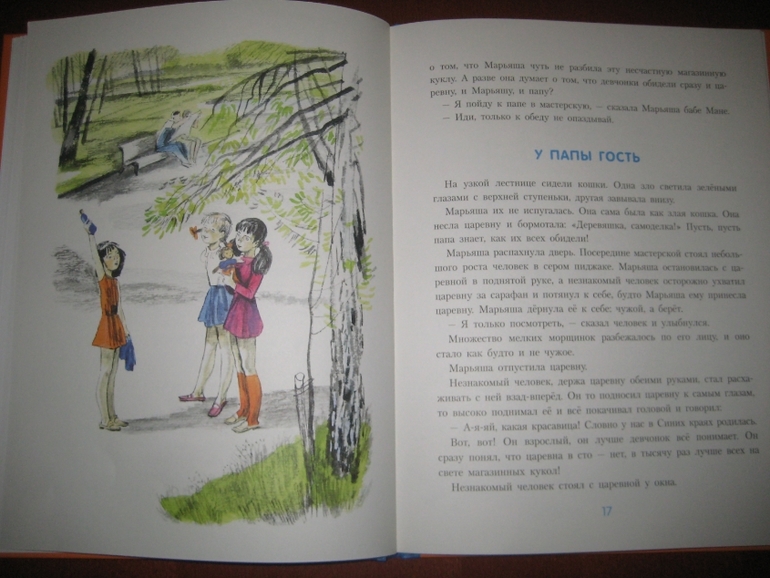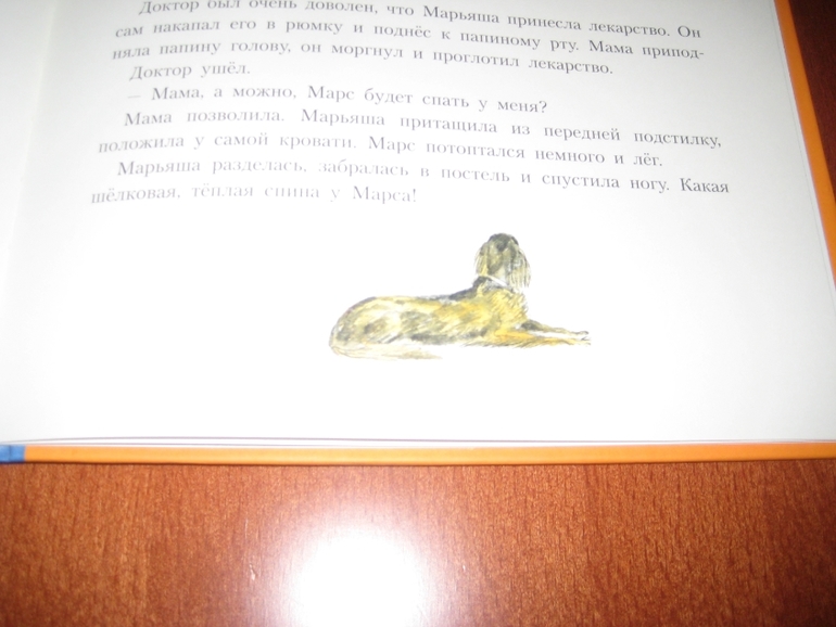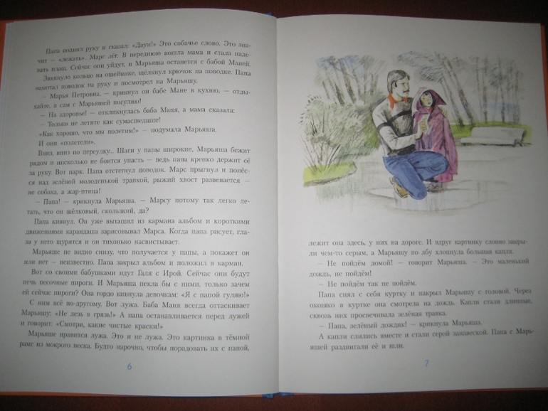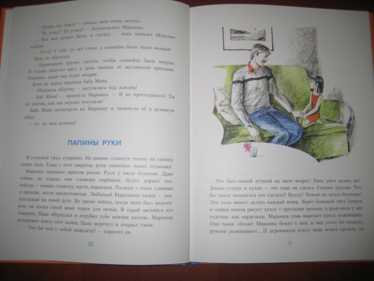 Для меня ключевые слова: "С папой". Это самый главный человек в жизни Марьяши. Человек необыкновенный, художник, способный, например, из простой деревяшки сделать чудесную куклу-царевну, у которой взаправду месяц под косой блестит... Который может поведать о путешествии в Синие края не обычными словами, а быстрыми рисунками-набросками... В конце концов, это человек, ради которого ты, маленькая и беззащитная, пойдешь ночью по улицам спящего города в аптеку со страшными оранжевыми глазами за лекарством... Книга о том, что в жизни есть самое главное. А главное - это семья, главное - это любовь :)