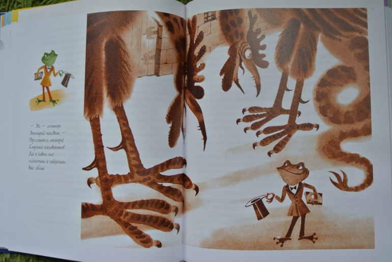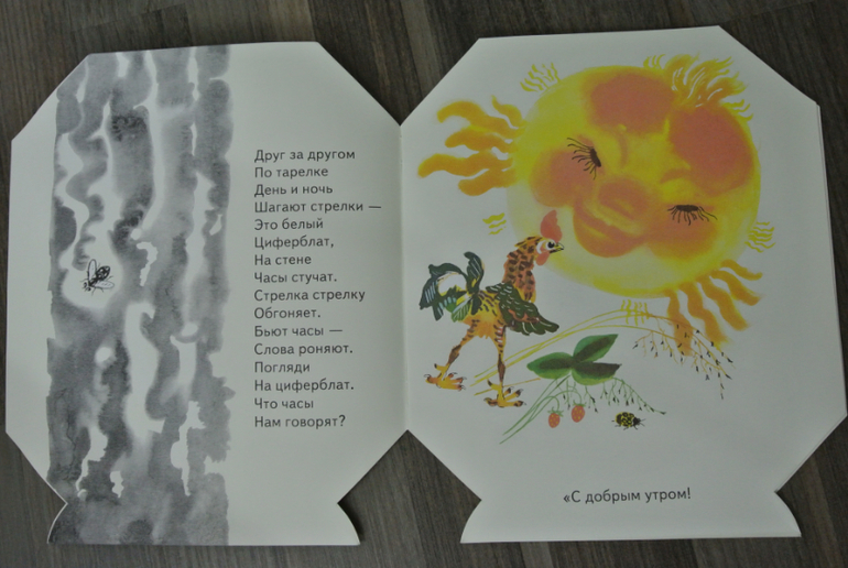 Второй нюанс этой книги - у нас стихи Сапгира в Часах, Речь позже выпустила аналогичное оформление со стихами Суслова, которые по многочисленным отзывам ложатся на рисунки лучше.