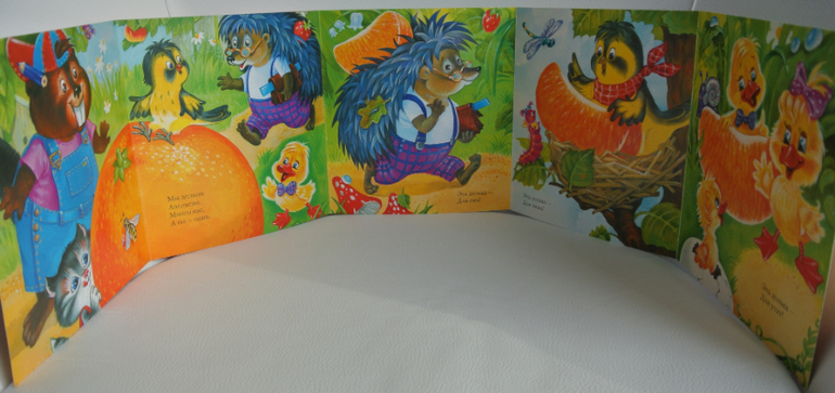 6. Мы делили апельсин - раскладушка, активно читается пиратке/пираткой. Спасибо доброму человеку, который показал ее на ББ. Дочь любит этот мульт/песенку, поэтому книжка пришлась по вкусу. Плюс очень уважает книжки-раскладушки. Это для нее всегда путешествие с широко открытыми глазами от удивления и восхищения