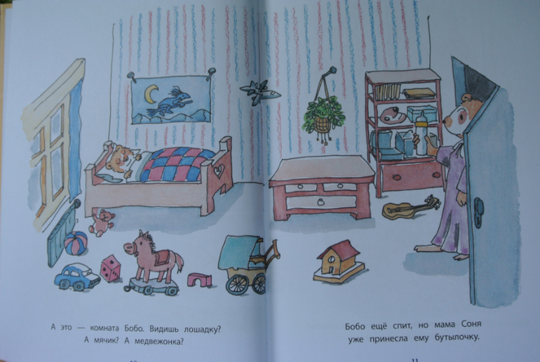 4. М.Остервальдер. Приключения маленького Бобо. Истории в картинках для самых маленьких - мега хит у пиратки! Присоединяюсь к многочисленным отзывам, что Бобо на малышей влияет магнетически. Жизнь малыша в картинках, сопровождающихся текстом. Как Бобо просыпается, как проходит будничное утро (аааа!!! списано с нашей жизни), как играет в кубики с папой. А вот Бобо отправился в зоопарк, в магазин, гулять, заболел...