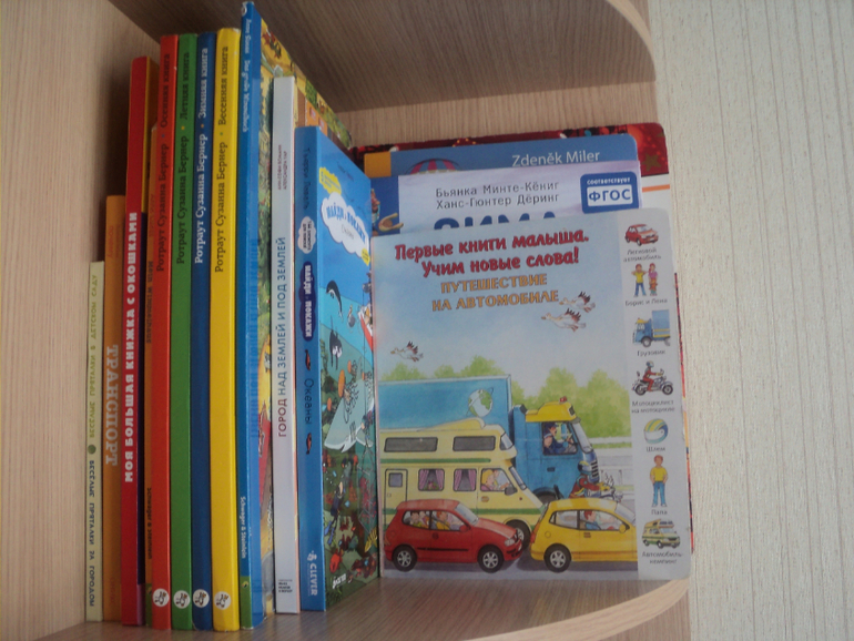 На верхнем ярусе обитают Виммельбухи, средний - энциклопедии и Ричард Скарри, книги с окошками. Художественные и стихи чуть ниже. И внизу том о машинках и изрядно потрепанный сыном глобус)