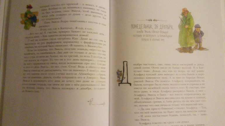 Развивая тему, после Пеппи мы стали читать Эмиля из Ленненберги. Тут надо сказать помогло Детское радио, где его читали и мы как-то услышали про него. Если выстроить Лотту, Эмиля и Пеппи по возрасту, то Эмиль будет в середине - 5 лет. Но в отличии от Лотты, он уже не только играет, но и помогает родителям, сам совершает сделки и наконец спасает человека, один отправившись с больным Альфредом, в город к доктору. А еще Эмиля не прощают сразу за проделки, которые он в основном совершает случайно, и постоянно наказывают. Вообще совсем другая история, но так же легко написана, как Пеппи. Тоже можно подкрепить шведским сериалом. Эмиля мы прочли быстро и с интересом, но как-то Пеппи читалась еще лучше. Может потому, что у меня девочка и ей интересней про девочек?