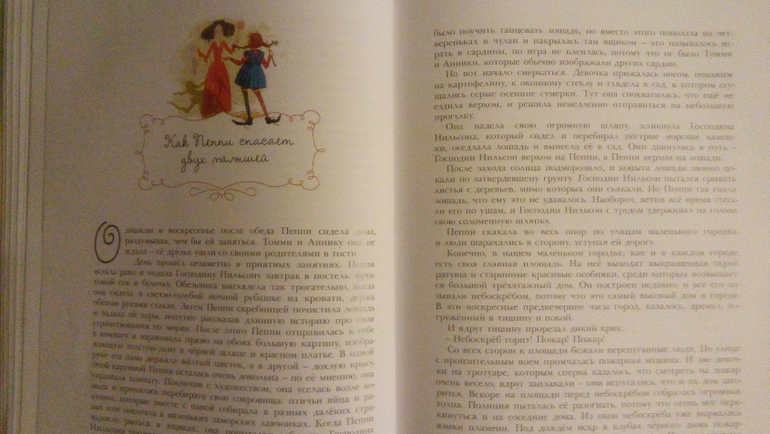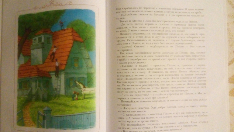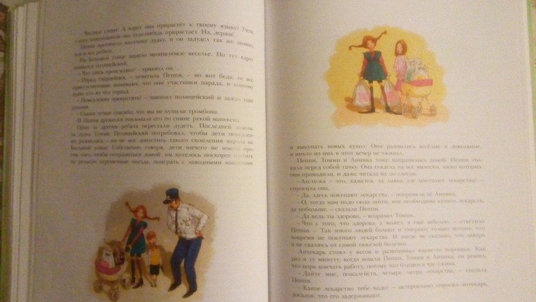 Наверное, правильнее было знакомство с ней начинать с Лотты, трехлетней девочке, книгу о которой я уже комментировал здесь, но первой мы начали читать в четыре года хулиганистую Пеппи Длинныйчулок. И она стала Лизиным кумиром на полгода. Лиза спала с одеялом на голову и ногами на подушке, как Пеппи, лазила куда только получалось забраться, как Пеппи, ходила задом наперед, в конце-концов носила разные носки. Вообще, брала с нее пример. По моему мнению, очень хорошая книга для детей, учит самостоятельности и развивает воображение. Очень легко читается. По прочтению, мы подкрепили книгу фильмами: нашим, после которого еще полгода распевали песни, и шведским многосерийным. Шведский фильм ближе к книге, сценарист там сама Астрид Линдгрен, но некоторые места уже отличаются. Видимо сюжет развивался. И еще сходили на спектакль. Я тут посмотрел, что некоторые родители считают, что Пеппи надо читать лет в десять, но я думаю вполне можно и дошкольникам.