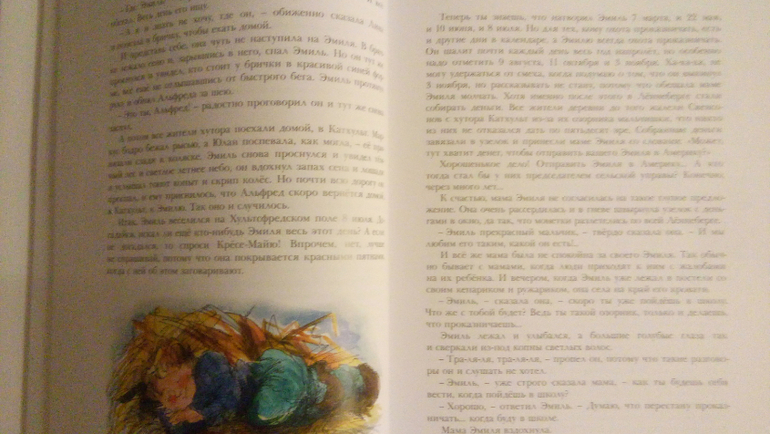 В заключении скажу, что все книги у нас издательства Махаон, мелованные, большого формата. Все замечательного перевода Лиллианы Лунгиной. Иллюстраций немного, но это обусловлено объемом произведений. Эмиля из Леннеберги иллюстрировала Наталья Кучеренко, а Пеппи Длинныйчулок и Малыша с Карлсоном - Арсен Джаникян.