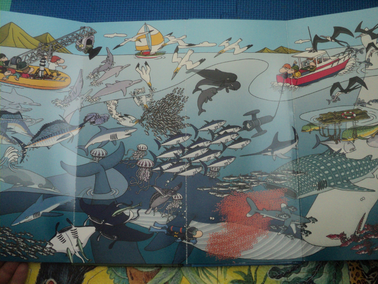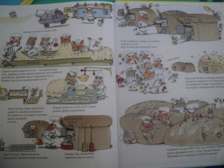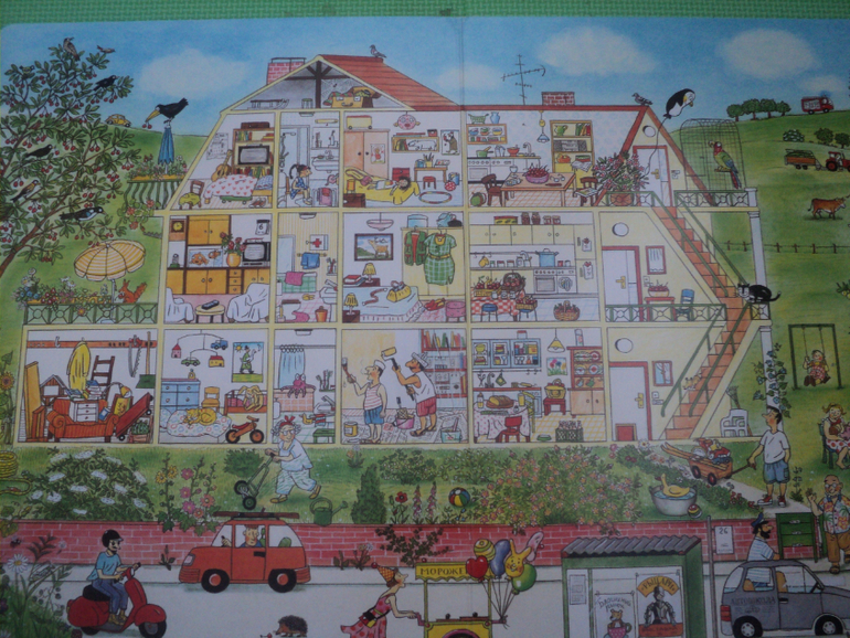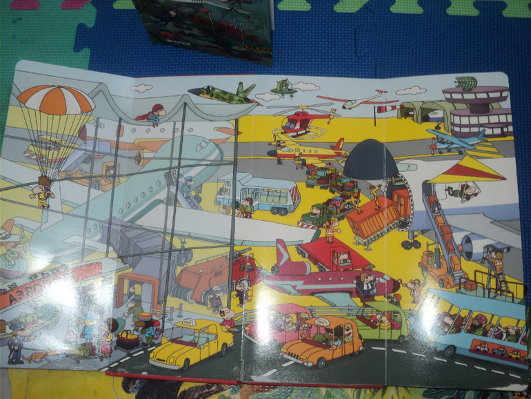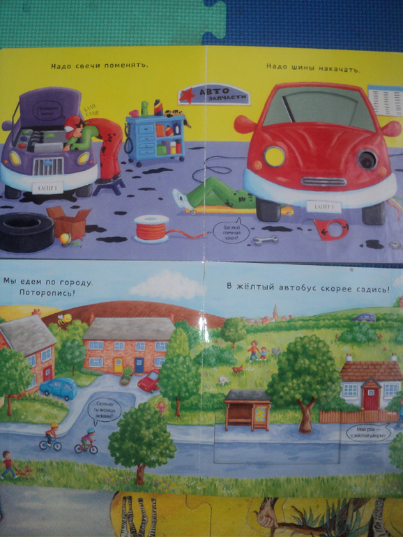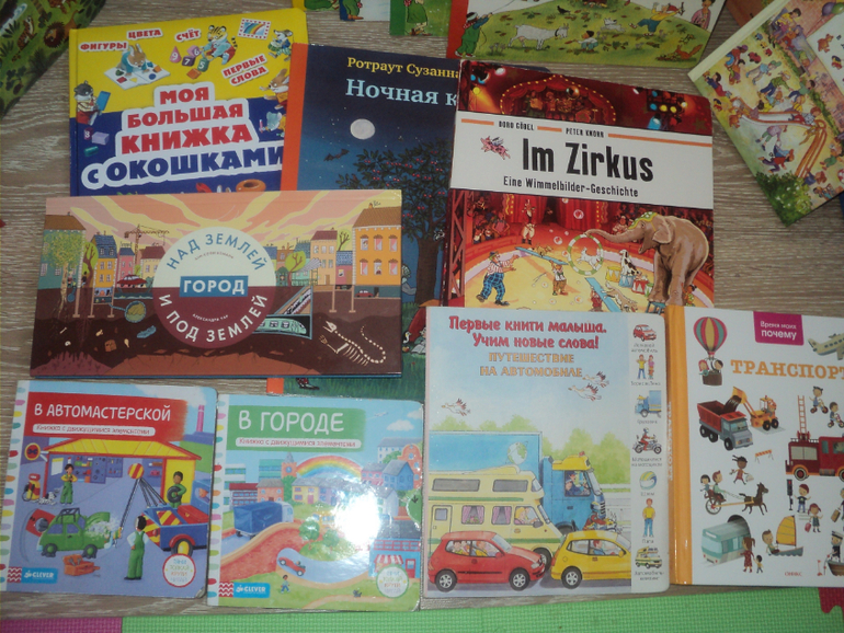 Еще один книжный аспект - это открытие в полтора года книг-гляделок, или виммельбухов. Наша любовь к ним началась с подаренной на новый год книги Сузанны Бернер «Весенняя книга». Мы и по сей день дружим с городком, знаем поименно всех жителей, с удовольствием сравниваем город в разное время года, дня и ночи. Обсуждаем ситуации - почему может плакать мальчик на вокзале, почему папа Лео покзывает на часы и строго смотрит на сына, читающего книгу с фонариком в палатке, почему Полина не отрывает глаз от книги и читает везде, а Сузанна бесконечно теряет шляпы. Ребенок описывает, что видит, выхватывает отдельных персонажей, канву же веду я. Постепенно у нас появился весь городок, потом добавились другие серии. Я не спешила скупать все, предпочитая покупать по одной книге и наблюдать, примет ли ее сын. Из всего, что у нас есть, особой любовью пользуется Транспорт. По большой книге из серии «Что? Зачем? Почему?» Анн-Софи Бауман мы выучили все виды машин. Не сильно ребенок принимает иллюстрации Тьерри Лаваля, вижу, что трудно воспринимаются сами картинки.