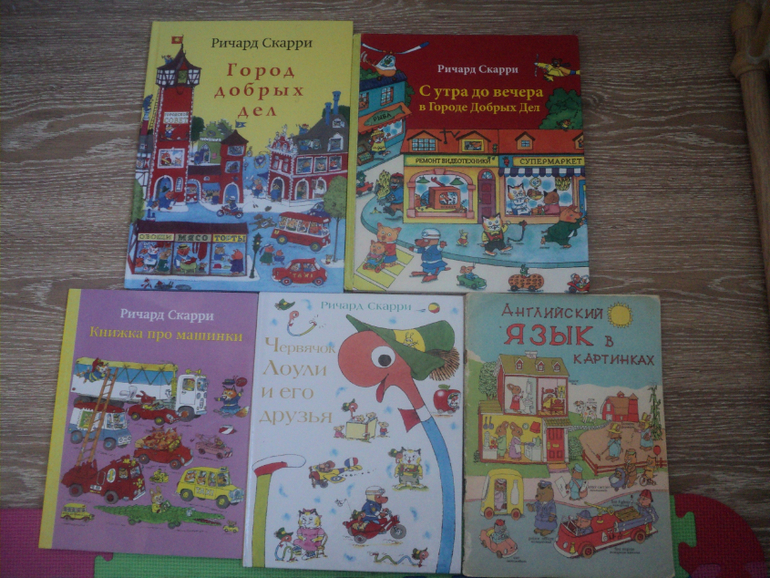 Продолжая тему любимых иллюстраторов, не могу не упомянуть Ричарда Скарри. Я неоднократно писала о наших книгах в его исполнительстве. Сын очень любит его героев, издания наполнены фантазией, небылицами, что развивает воображение и радует глаз. Поэтому по его книгам мы учились счету и хорошим манерам, видам машинок, даже первым английским словам. Сейчас с удовольствием осваиваем «Самую лучшую книгу».