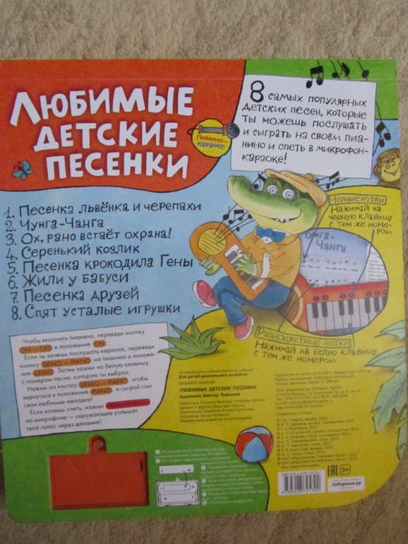 Производители конечно схитрили - всё таки в книге не песенки,а только мелодии к ним и слова, которые ты можешь спеть под них. Ложка дёгтя - микрофон слабенький, надо близко подносить его ко рту, чтобы было хорошо слышно, но когда подносишь слишком близко, то он фонит (( Однако это нам не мешает