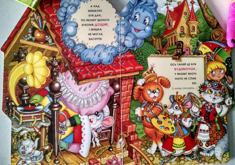 2. Даже еще практически неговорящий ребенок может читать вместе с мамой. В комнате над мальчиком жил песик и всю ночь он говорил.... Гав-гав! А над песиком мяукала кошечка...Мяу-мяу! А в комнате над кошкой всю ночь грызла дыру мышка - здесь мы заменяли на "скреблась" и слегка скребли по книге. А "дождик" у нас тоже стучал по нарисованной крыше пальчиками.