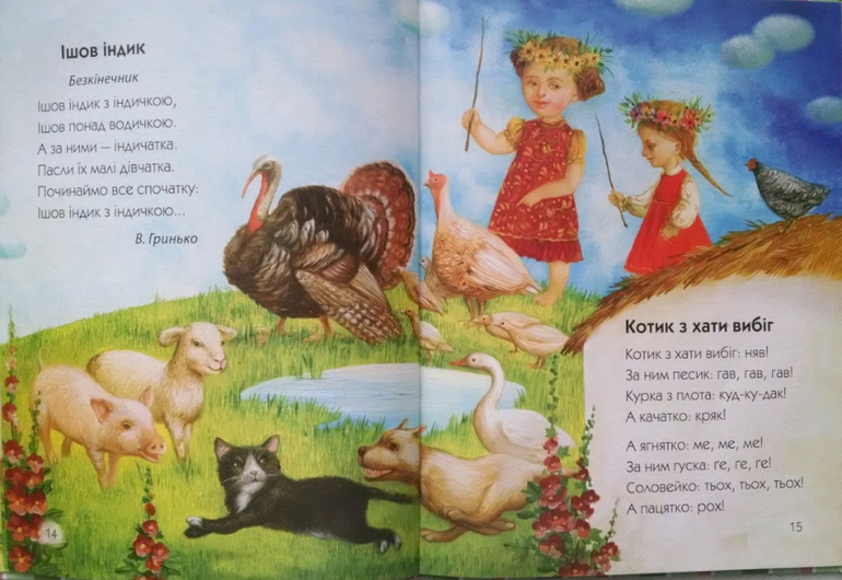 Тот редкий случай, когда ВСЕ стихи из сборника ребенок любит. Очень удачная подборка. При том, даже народные потешки подобраны так, что они звучат современно - не надо голову ломать, как это ребенку объяснить. Иллюстрации шикарны, моим темным фото не верьте, лучше на официальном сайте прьевю посмотрите. Особенно порадовали изображения людей, а мне очень редко нравятся реалистичные портреты в детских книгах. Вот на этом развороте - моя дочка убеждена, что это она в водичке плещется.