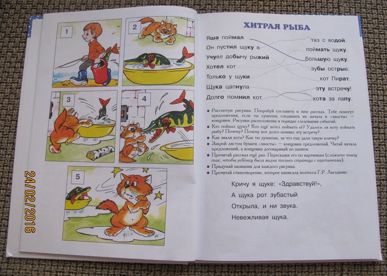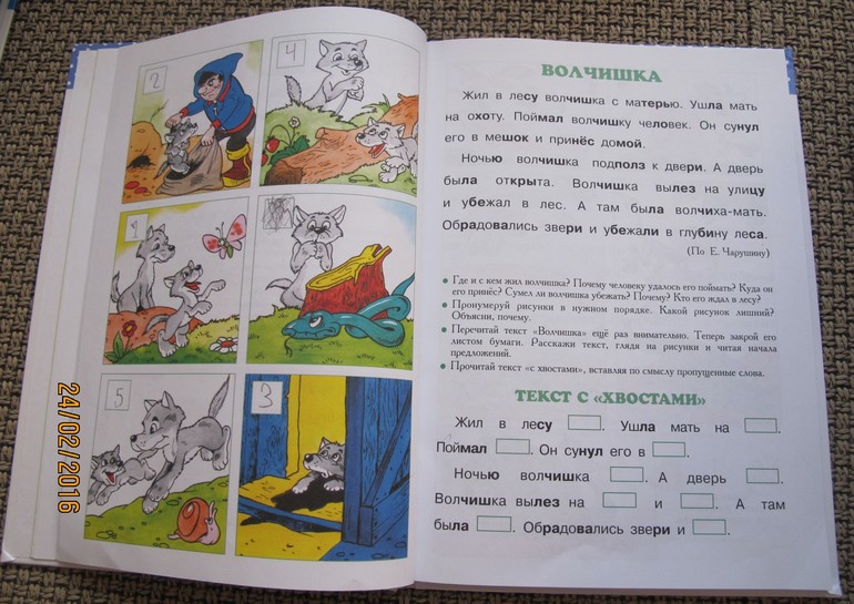 Давненько уже купила книгу Тексты с дырками и хвостами, да дочка все никак не проявляла желания ей заниматься. А тут вдруг прорвало - понравилось. Читать немного, задания выполнять интересно, особенно рассказать по картинкам - это её страсть.)))