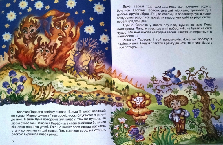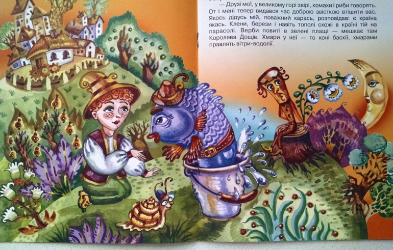 Королева дощів. В лес пришли "поторочі", они все иссушали, уничтожали, а детки, завидев их, плакали. Но умный мальчик и Карасик позвали Королеву дожей, которая прогнала вредителей.