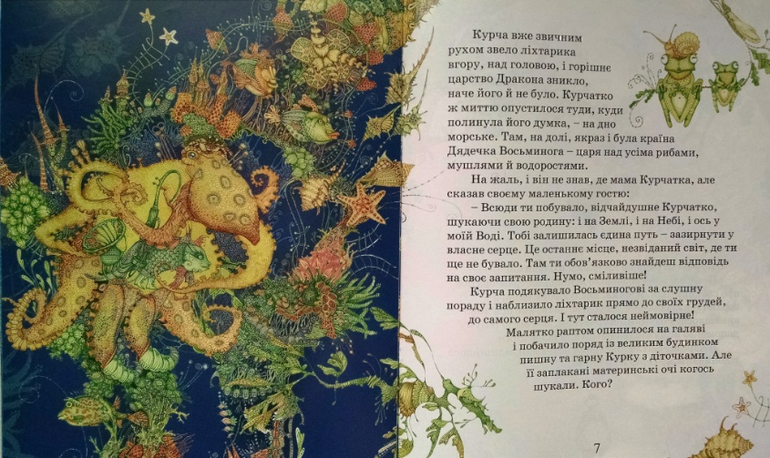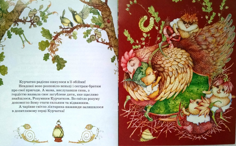Розумне курчатко. Всего 4 разворота, но какие же там иллюстрации! Все такое ажурно-изящное. Сюжет: цыпленок ищет маму и обращается к властителям неба, моря и земли. они советуют поискать маму в своем сердце. Я сфоткала все развороты, кто может, прочтите, не пойму, но что-то меня смущает в этом совете "поискать в своем сердце".