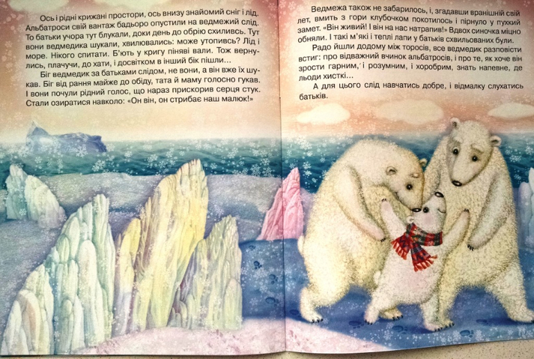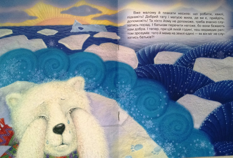 Белый мишка удрал от родителей, сел на льдину и его унесло в море.Льдина стала таять, птицы взяли сетку, посадили мишку в нее, как в гамак, и вернули родителям.