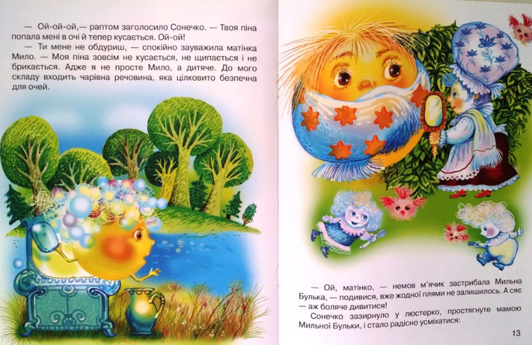 А это книга "Як сонечно плям позбавилось" . Сюжет не понравился. Солнышко проснулось и обнаружило, что грязное. С чего бы? А раньше как было? Оно встретило мыльную Бульбашку и она отвела Солнышко к маме Пенке. Ну такоэ, как говорится. Прочтите кусочек текста - прям как минутка рекламы.