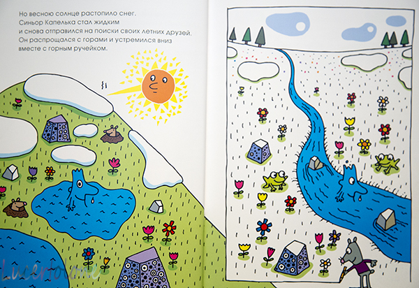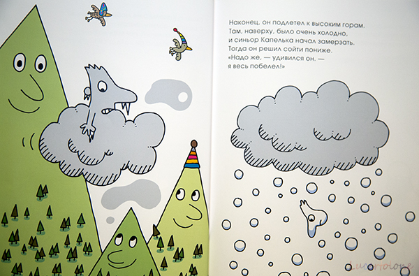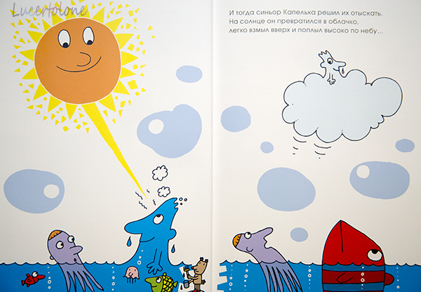 Наша первая и, как водится, самая любимая книга так и называется: "Необыкновенное путешествие синьора Капельки". Собственно она и есть о круговороте воды в природе. Не ждите схем со стрелочками, это настоящий приключенческий рассказ о капле в море, которая отправилась на поиск летних друзей-малышей.