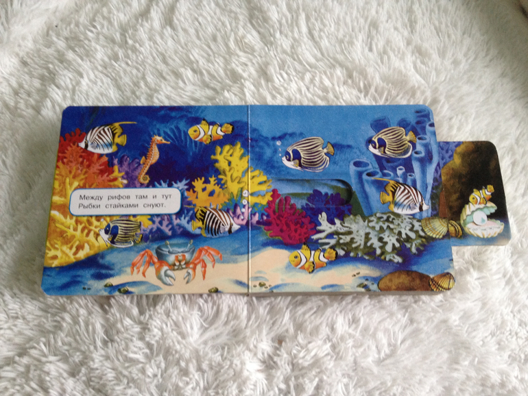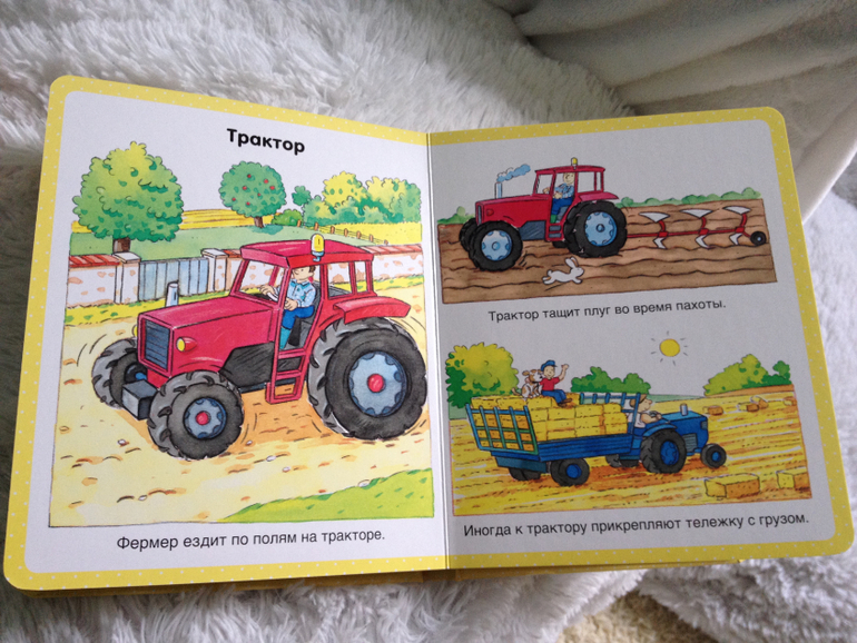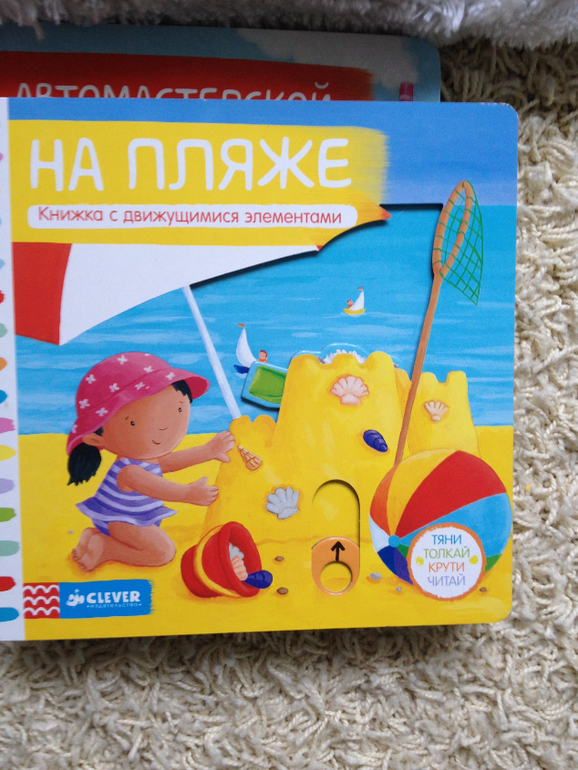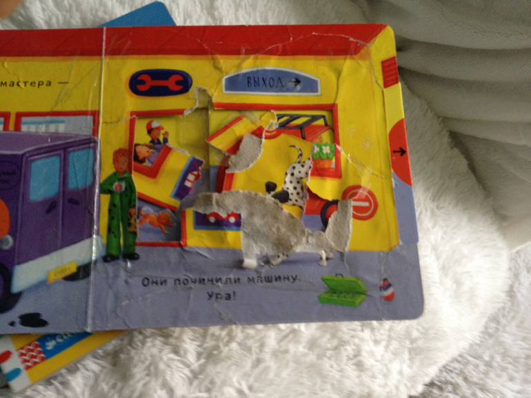Как видно,"читай" там на последнем месте. Самое главное в этих книгах- наличие волшебства в виде подвижных элементов. Но тут печальная история. Выдала сыну в личное пользования В автомастерской. Весь день с ней носился. А утром муж забегает в комнату и говорит не ходи пока к мелкому, хватает скотч и уходит. 5 минут я не выходила, потом не выдержала, захожу- сидит муж на полу клеит книжку . Там на последнем развороте машина выезжает подвижная, видимо, сын хотел узнать откуда выезжает и куда едет...В общем результат видите сами. И это при том, что обычно муж мне радостно кричит из комнаты- Иди,он там твои книги рвет! ...А тут ему самому она нравилась. Жалко..(