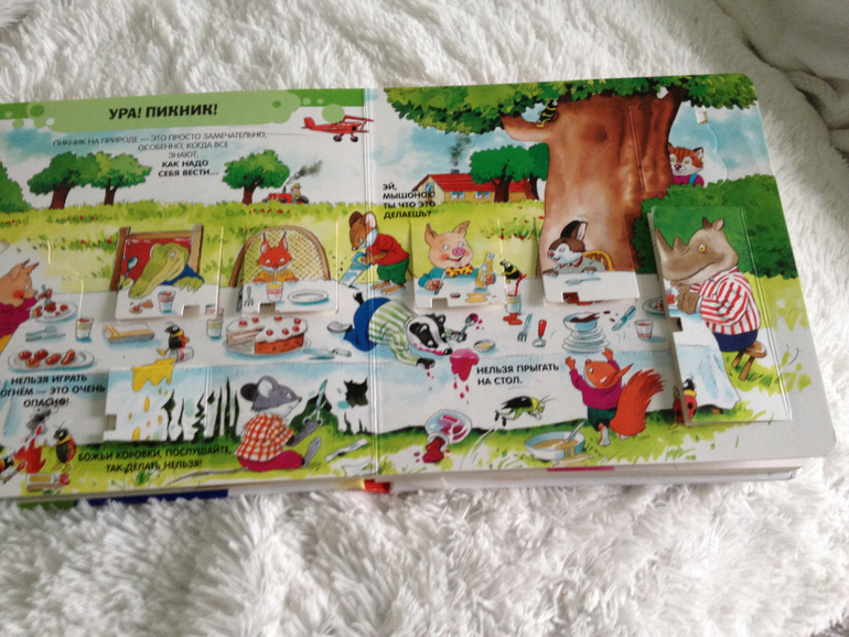 Вот это у нас 100% хит. Смотрим ее по сто раз на дню. Один клапан наш папа уже клил, хотя эти клапаны самые тостые и прочные из всех книжек с клапанами, что у нас есть. Тут ооочень много что порассматривать, цвета, счет, дни недели. Наш любимый разворот-пикник. Раньше сын очень любил залазить на кухонный стол. Еле отучили его. И тут он увидел барсука на обеденном столе и теперь всегда грозит ему пальцем и говорит ай-яй-яй. Так мило и смешно выходит)